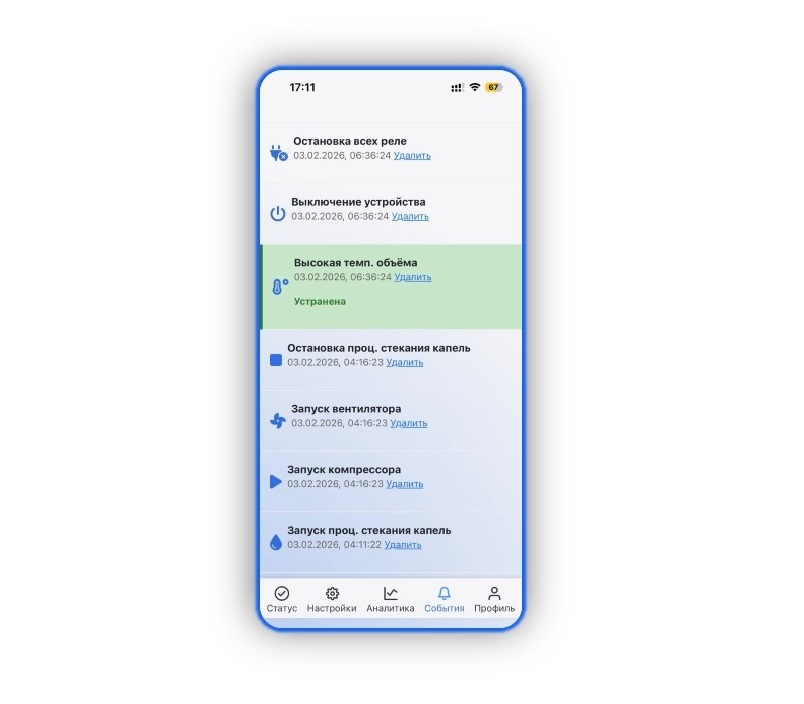 Встроенный мониторинг с мгновенными оповещениями Пуш-уведомления и e-mail при первых признаках отклонений: скачок температуры, сбой датчика, превышение лимита. Ваши продукты защищены — даже когда вас нет рядом.