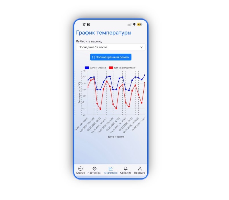 На едином графике вы видите не только динамику температуры со всех датчиков, но и события, которые происходили в те же моменты времени: срабатывание аварий, изменение режимов, подключение или потерю связи. Это позволяет мгновенно сопоставить скачки температуры с причинами, которые их вызвали. График масштабируется (zoom), разворачивается на весь экран и гибко настраивается по периоду — от последнего часа до нескольких недель, чтобы вы всегда могли детально проанализировать любой участок истории.